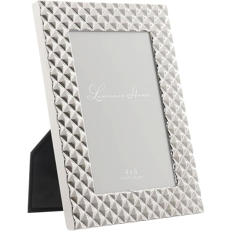 Main view Product Details Lawrence Frames® Silver Diamond Polished 4x6 frame — Classic, beautifully crafted metallic frame. Frame features an elegant geometric style border. Features glare resistant glass lens and hardboard backing. By Lawrence Frames, fine frames for generations. Silver Diamond Polished 4x6 frame Model #751148089388 List $18.00 You pay $12.95 This item IS in stock and can be expected to ship 02/05/2026 Your Price Match is Active Your request for a price of $0.00 for a minimum quantity of has been accepted. You have [time] left to purchase this item for $0.00 instead of $12.95 each. Find a Lower Price? We BEAT All Authorized Retailers [?] FEATURESDisplays:4"x6"Material:SilverplateFinish:SilverOccasion:Congratulations, Engagement, Friendship, Home decoratingStyle:Contemporary, SophisticatedOrientation:BothBrand:Lawrence Frames®Display Type:Desktop or Wall This item ships in its own box SHARE THIS ITEM Share on Facebook