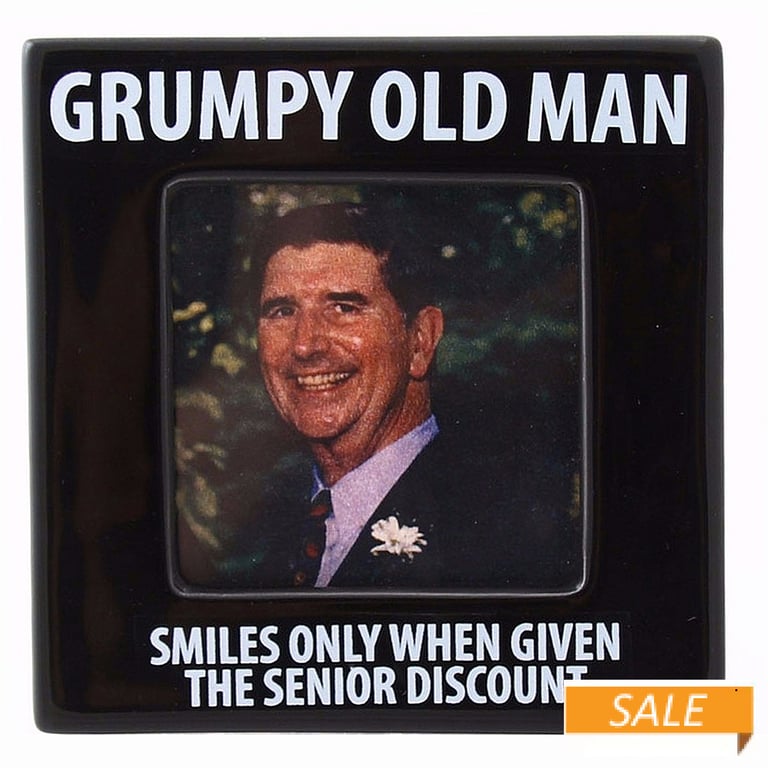 Main view Signature gift box Product Details Enesco GRUMPY OLD MAN photo frame by OUR NAME IS MUD® — GRUMPY OLD MAN SMILES ONLY WHEN GIVEN THE SENIOR DISCOUNT EXTRA! EXTRA! SEE all about it! What a GREAT gift for the birthday senior. Holds a 3" x 3" photo. Glare resistant glass lens. Easel back for horizontal tabletop display. Designed by Lorrie Veasey. Another VERY CLEVER (and adorable) frame by Really Great News®. GRUMPY OLD MAN photo frame by OUR NAME IS MUD® Model #045544613590 List $12.00 You pay $5.90 In stock Your Price Match is Active Your request for a price of $0.00 for a minimum quantity of has been accepted. You have [time] left to purchase this item for $0.00 instead of $5.90 each. Find a Lower Price? We BEAT All Authorized Retailers [?] FEATURESDisplays:2"x2"Material:CeramicFinish:BlackOccasion:Birthday, Grandparent`s DayStyle:Words & whimsy, ContemporaryOrientation:BothBrand:EnescoDisplay Type:Desktop Only Approx. Overall Dimensions:4 1/8"x4 1/8"x1/2" This item ships in its own box SHARE THIS ITEM Share on Facebook
