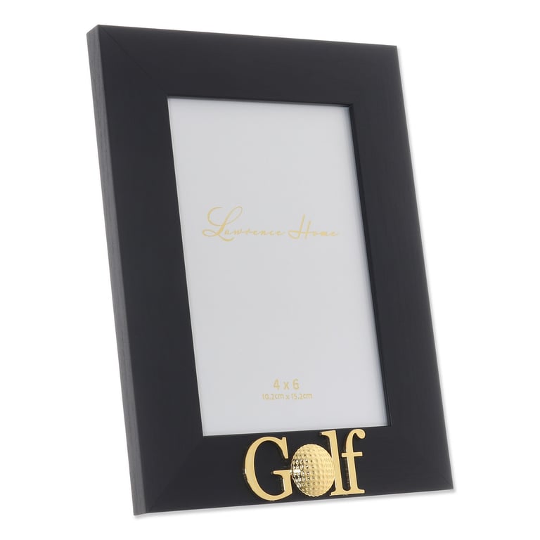 Main view Product Details Lawrence Frames® GOLF celebration 4x6 frame — Score big points with your golf partners - a special frame to celebrate the game. Here, the GOLF BALL frame. Golf accent is gold metallic on a faux ebony wood base. Glare resistant glass lens. Easel back and wall mount included. Personalizing is available on this special frame. By Lawrence Frames®, fine frames for generations. GOLF celebration 4x6 frame Model #751148093644 List $18.50 You pay $15.95 In stock Ships next business day [?] Your Price Match is Active Your request for a price of $0.00 for a minimum quantity of has been accepted. You have [time] left to purchase this item for $0.00 instead of $15.95 each. Find a Lower Price? We BEAT All Authorized Retailers [?] FEATURESDisplays:4"x6"Material:Wood (mdf/engineered)Finish:Black, GoldOccasion:Birthday, Friendship, Good luck, Inspirational, Thank-Motivate-Reward, Father`s DayStyle:Contemporary, Sports & leisure, Words & whimsy, Unique | LimitedOrientation:Vertical OnlyBrand:Lawrence Frames®Display Type:Desktop or Wall Approx. Overall Dimensions:6"x8"x13/16" This item ships in its own box SHARE THIS ITEM Share on Facebook