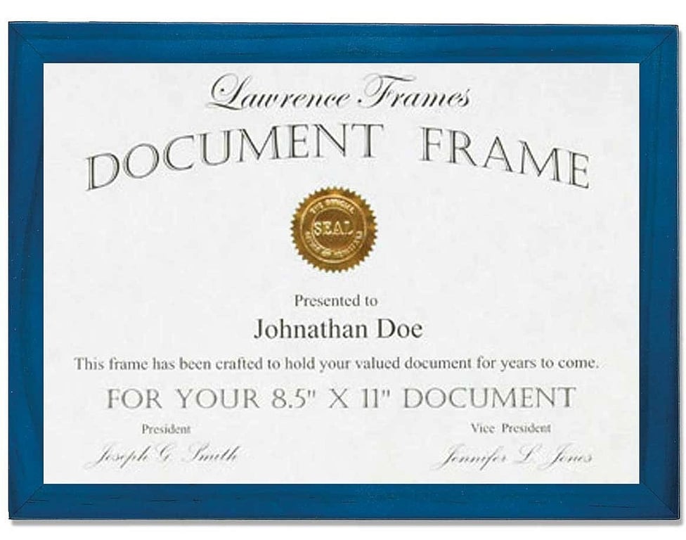 Main view Back view (sample) Product Details Lawrence Frames® BLUE square-corner frame 8½x11 by Lawrence® — Marine-blue frame is elegant and an easy style to proudly display your print or certificate.Constructed of matched varnished hardwoods with tailed corners and exact fitting back. Frame edge is a very contemporary ½" all-around.Dual easel for landscape or portrait tabletop use; wall mounting hooks included. Glare resistant glass lens. By Lawrence®. Click the Lawrence Frame collection to shop the entire line. BLUE square-corner frame 8½x11 by Lawrence® Model #751148057776 List $25.00 You pay $19.95 In stock Ships next business day [?] Your Price Match is Active Your request for a price of $0.00 for a minimum quantity of has been accepted. You have [time] left to purchase this item for $0.00 instead of $19.95 each. Find a Lower Price? We BEAT All Authorized Retailers [?] FEATURESDisplays:8.50"x11"Material:Wood (full grain)Finish:BlueOccasion:Business & office, Craft Projects, Graduation, Home decorating, Teacher gifts, Team & coach giftsStyle:Architectural, Classic, Contemporary, MinimalOrientation:BothBrand:Lawrence Frames®Display Type:Desktop or Wall Approx. Overall Dimensions:9 1/4"x11 3/4"x1/2" This item ships in its own box SHARE THIS ITEM Share on Facebook