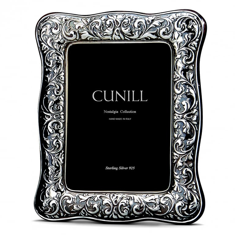 Main view Product Details Cunill® Silver ATHENA Nostalgia Sterling Silver 5x7 frame by Cunill® — From the Cunill archives, ATHENA is a wonderful period style in heirloom quality, hand-tooled sterling silver.The Cunill quality is unsurpassed. Each piece is made from a single sheet of fine sterling silver.Even the backing, a fitted wood piece to easily lock-in your photos, makes this a home decorative piece rather than a simple "frame". Note the signature sterling lozenge latch - a hallmark of Cunill since 1916. Each piece is debossed on front with the family mark and .925 (sterling silver), proudly giving signature to the quality this 100+ year old company has earned.Cunill sterling never needs polishing - it is finely lacquered to keep it tarnish free. Shipped in signature Cunill black gift box.The Cunill NOSTALGIA Collection, crafted in and imported from Italy. To view the complete collection, visit: Cunill® ATHENA Nostalgia Sterling Silver 5x7 frame by Cunill® Model #44107201 List $210.00 You pay $196.95 In stock Ships next business day Your Price Match is Active Your request for a price of $0.00 for a minimum quantity of has been accepted. You have [time] left to purchase this item for $0.00 instead of $196.95 each. Find a Lower Price? We BEAT All Authorized Retailers [?] FEATURESDisplays:5"x7"Material:Sterling Silver (fine)Finish:SilverOccasion:Anniversary, Baby shower, Birthday, Baptism + Christening, Communion, Engagement, Friendship, Good luck, Graduation, Romantic, Sweet 16, WeddingStyle:Antique, Baroque, Ornate, Sophisticated, Vintage Victorian, RomanticOrientation:BothBrand:Cunill® SilverDisplay Type:Desktop Only This item ships in its own box SHARE THIS ITEM Share on Facebook