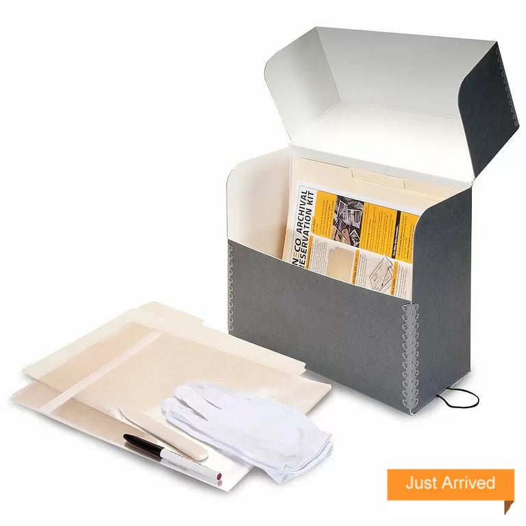Main view Product Details Lineco Inc. Archival Preservation Kit by Lineco® — The kit is enclosed in an Archival Document Case- the standard in archival storage. The letter sized flip-top document case provides easy access to your important documents, photos, and other valued items, while providing protection from dust and light. It is constructed from blue/gray acid-free, buffered board with a white liner. Metal edge, adhesive-free corners provide stacking strength and nylon pull string aids in removal from shelving. Included in the kit: 12 Archival File Folders,Letter Sized, made from acid and lignin free 10 pt. folder stock in light tan for exceptional strength and endurance 10 Photo/Art Bags, 8.5” x 11” for crystal-clear, re-sealable archival storage and protection from dirt, dust, and fingerprints 1 pair of Cotton Gloves 1 - Genuine Bone Folder for folding and creasing 1 - pH Testing Pen to identify and separate acidic materials and avoid off-gassing. Made in the USA by Lineco® Archival Preservation Kit by Lineco® Model #099295008921 List $45.00 You pay $39.95 This item can be expected to ship by 01/05/2026. Order now by clicking ADD TO CART (below); you are only charged when we actually ship. Or, Click here to be automatically notified when it comes back in stock. Your Price Match is Active Your request for a price of $0.00 for a minimum quantity of has been accepted. You have [time] left to purchase this item for $0.00 instead of $39.95 each. Find a Lower Price? We BEAT All Authorized Retailers [?] FEATURESMaterial:Archival | Photo-SafeFinish:ClearOccasion:Business & office, Craft ProjectsStyle:Hi-tech, Sports & leisureBrand:Lineco Inc.Display Type:not applicable n/a SHARE THIS ITEM Share on Facebook