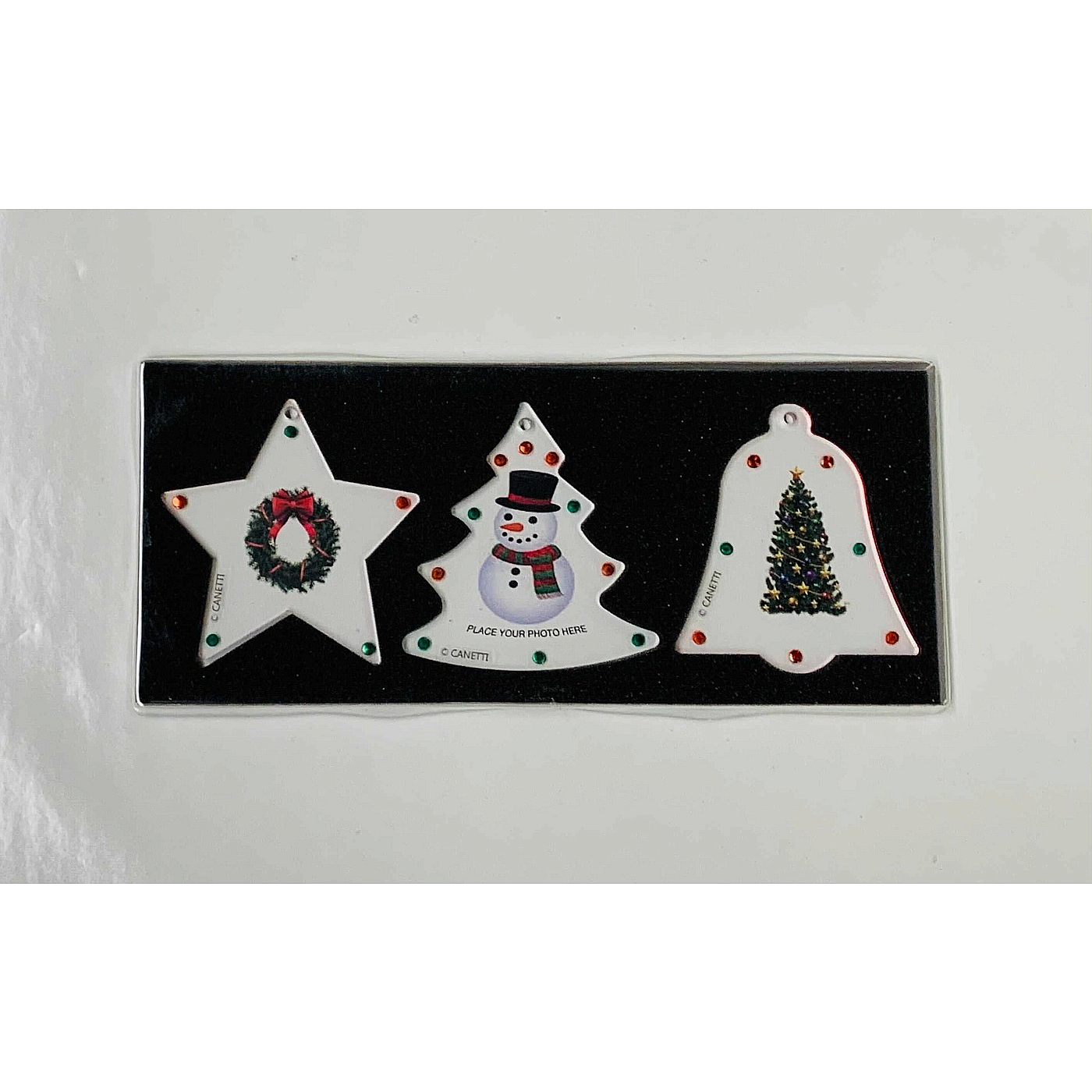 Main view gift boxed Product Details Canetti Design® Christmas Tree Ornaments MAGNET FRAME SET (of 3) by Canetti® — A super stocking stuffer or Secret Santa gift! Set contains STAR / TREE / BELL Your wallet-size print will appear to float in borderless space, as if suspended in air!That's the power of this wonderful desk frame. Super strong pill-sized magnets securely and firmly sandwich your photo for this wonderful effect. Luxe quality "Magnet" is made in ultra-clear virgin acrylic. Set is packed in a "ready-to-give" gift box. To shop the entire line, click Canetti Museum Frames. Christmas Tree Ornaments MAGNET FRAME SET (of 3) by Canetti® Model #756100990023 List $24.00 You pay $20.95 In stock Ships next business day [?] Your Price Match is Active Your request for a price of $0.00 for a minimum quantity of has been accepted. You have [time] left to purchase this item for $0.00 instead of $20.95 each. Find a Lower Price? We BEAT All Authorized Retailers [?] FEATURESDisplays:2"x3"Material:Acrylic | ResinFinish:Green, Red, ClearOccasion:Group Events + Parties, Teacher gifts, ChristmasStyle:Contemporary, Double-sided, Teens & tweens, Unique | LimitedBrand:Canetti Design®Display Type:not applicable n/a This item ships in its own box SHARE THIS ITEM Share on Facebook