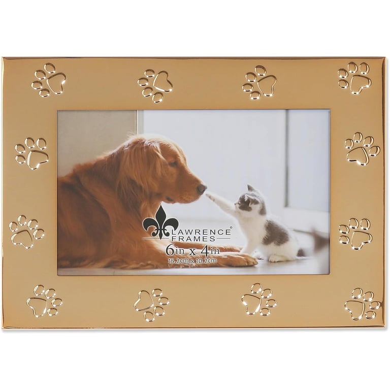 Main view Product Details Lawrence Frames® Golden PAW PRINT 4x6 frame — Celebrate your favorite dog or cat with this special PAW PRINT frame Adorable polished goldplated metal dog or cat picture frame. High quality heavy weight metal picture frame has a raised paw print design. Easy open black velvet slide-in backing with easel for horizontal table top display. Quality construction and materials, high definition glass to protect your photo. By Lawrence Frames. Golden PAW PRINT 4x6 frame Model #751148089715 List $23.00 You pay $17.95 This item IS in stock and can be expected to ship 02/11/2026 Your Price Match is Active Your request for a price of $0.00 for a minimum quantity of has been accepted. You have [time] left to purchase this item for $0.00 instead of $17.95 each. Find a Lower Price? We BEAT All Authorized Retailers [?] FEATURESDisplays:4"x6"Material:Gold plateFinish:GoldOccasion:FriendshipStyle:Animals & pets, ContemporaryOrientation:BothBrand:Lawrence Frames®Display Type:Desktop or Wall This item ships in its own box SHARE THIS ITEM Share on Facebook
