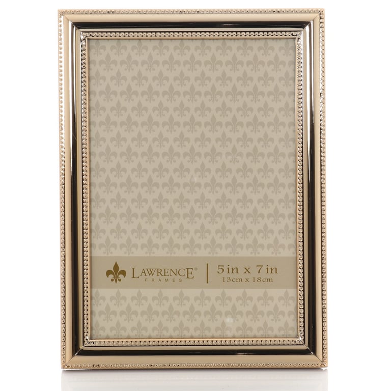 Main view Product Details Lawrence Frames® Gold Bead 5x7 frame — Classic, beautifully crafted metallic frame. Frame features an elegant "caviar" beaded trim border. Features a double bead inner/outer trim accent. Features glare resistant glass lens and hardboard backing. By Lawrence Frames®, crafting fine frames for generations. Gold Bead 5x7 frame Model #751148051347 List $30.00 You pay $21.95 In stock Can be shipped today [?] Your Price Match is Active Your request for a price of $0.00 for a minimum quantity of has been accepted. You have [time] left to purchase this item for $0.00 instead of $21.95 each. Find a Lower Price? We BEAT All Authorized Retailers [?] FEATURESDisplays:5"x7"Material:Gold plateFinish:GoldOccasion:Business & office, Celebrating Travels, Friendship, Home decoratingStyle:Classic, Contemporary, Sophisticated, TraditionalOrientation:BothBrand:Lawrence Frames®Display Type:Desktop or Wall Approx. Overall Dimensions:6"x8"x5/8" This item ships in its own box SHARE THIS ITEM Share on Facebook