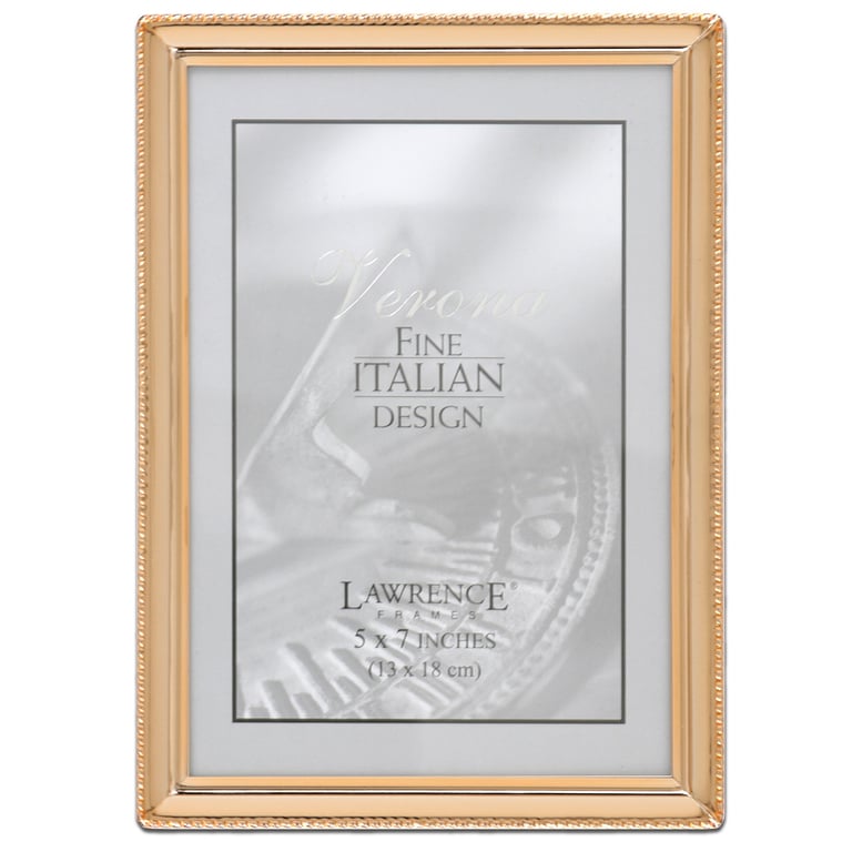 Main view Product Details Lawrence Frames® Gold plated w/caviar bead trim 5x7 FRAME — Polished gold plate frame, nicely crafted with invisible seams and corners.Attractively backed for wonderful desk appeal.Glare resistant glass lens. Dual easel backed for landscape or portrait display. Wall mounts for easy hanging.By Lawrence Frames®, crafting fine frames for generations. Gold plated w/caviar bead trim 5x7 FRAME Model #751148078993 List $24.50 You pay $18.95 This item IS in stock and can be expected to ship 02/02/2026 Your Price Match is Active Your request for a price of $0.00 for a minimum quantity of has been accepted. You have [time] left to purchase this item for $0.00 instead of $18.95 each. Find a Lower Price? We BEAT All Authorized Retailers [?] FEATURESDisplays:5"x7"Material:Gold plateFinish:GoldOccasion:Anniversary, Birthday, Good luck, Retirement, Romantic, Valentine`s Day, WeddingStyle:Classic, Traditional, RomanticOrientation:BothBrand:Lawrence Frames®Display Type:Desktop or Wall This item ships in its own box SHARE THIS ITEM Share on Facebook