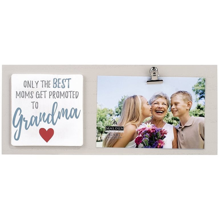 Main view Product Details Malden Designs® BEST MOMS GET PROMOTED TO GRANDMA Clip Frame by Malden® — Designed and crafted by Malden®, this inspirational clip frame with cursive inscription will certainly become a conversation starter in any casual setting. ONLY THE BEST MOMS GET PROMOTED TO Grandma Comfortably displays photos or prints up to 6"x4". Wall mounts included for easy hanging. Malden® is a leader in unique frames and home décor for every home and work environment. BEST MOMS GET PROMOTED TO GRANDMA Clip Frame by Malden® Model #096287156011 List $16.00 You pay $11.95 In stock Can be shipped today [?] Your Price Match is Active Your request for a price of $0.00 for a minimum quantity of has been accepted. You have [time] left to purchase this item for $0.00 instead of $11.95 each. Find a Lower Price? We BEAT All Authorized Retailers [?] FEATURESDisplays:4"x6"Material:Wood (mdf/engineered)Finish:Gray/Charcoal, Natural, WhiteOccasion:Birthday, Grandparent`s Day, Inspirational, Mother`s Day, Public Area Display, Valentine`s DayStyle:Contemporary, Distressed - Weathered, Sports & leisure, Words & whimsy, Sentiments | ready madeOrientation:Horizontal OnlyBrand:Malden Designs®Display Type:Desktop or Wall Approx. Overall Dimensions:12"x5"x1" This item ships in its own box SHARE THIS ITEM Share on Facebook