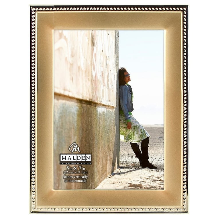 Main view Product Details Malden Designs® 2-tone Golden 5x7 frame with Caviar Bead Trim — This nicely crafted goldtone frame style has simple construction and an elegant beaded trim.The caviar beading is uniquely on the outer edge of the moulding. Features tailored corners and fitted dual easel back for landscape or portrait tabletop use. Glare resistant glass lens. By Malden®. 2-tone Golden 5x7 frame with Caviar Bead Trim Malden Designs® HOLIDAY CELEBRATION Savings - ends SundayBuy More / Save More * Add this item to your cart for the full details of this promotion. Conditions may apply. Model #096287999946 List $19.50 You pay $14.95 In stock Can be shipped today [?] Your Price Match is Active Your request for a price of $0.00 for a minimum quantity of has been accepted. You have [time] left to purchase this item for $0.00 instead of $14.95 each. Find a Lower Price? We BEAT All Authorized Retailers [?] FEATURESDisplays:5"x7"Material:Gold plateFinish:GoldOccasion:Business & office, Corporate gifts, Home decorating, Romantic, Teacher gifts, Team & coach gifts, Thank-Motivate-Reward, Celebrating TravelsStyle:Antique, Colonial, Early American, Traditional, RomanticOrientation:BothBrand:Malden Designs®Display Type:Desktop or Wall Approx. Overall Dimensions:7 1/8"x8 3/4"x1" This item ships in its own box SHARE THIS ITEM Share on Facebook